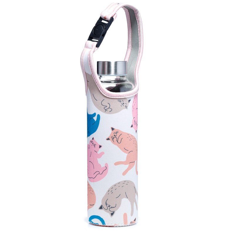 Garrafa de vidro com desenhos de gatos estampados, com manga de neoprene para manter a temperatura dos líquidos.